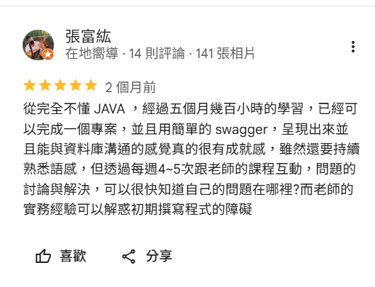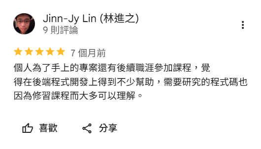從十月至今,已經上了將近半年的培訓課,讓我從甚麼都不會的小白到現在能做出屬於自己的後端專案,真的非常感謝老師以及助教的協助~期間課程管理師也都會打電話來定期關心學員的狀況~然後根據回饋再與老師做課程上的調整,真的超用心~推推