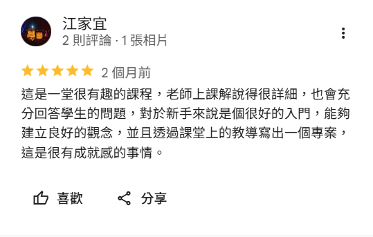 我學習的是後端工程師必修跟進階課程,從完全不懂到學習到非常多的程式語言,我覺得蠻好的;上課老師很有耐心,從很簡單的例子去講解很多艱深的程式碼,除了這些工具之外,也會分享自己在業界的經驗及面試的注意要點,對於想要在這個領域工作的同學會有很大的幫助。後面的課程,會做自己想做的專案,可以透過跟同學一起討論分享,整個上課過程都是滿有趣的,雖然是寫code但是不會無聊。